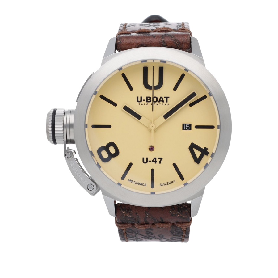Ihrer Funktion nach ist die U-BOAT ein Multitalent. Der Großvater des heutigen Inhabers Italo Fontana entwickelte es im Auftrag des italienischen Kriegsministeriums zum Fronteinsatz der Marineoffiziere und Luftwaffe. Ihrem Charakter nach Marcello Mastrioanni, Giovanni Agnelli und Gianni Versace in Personalunion. Ihre Kennzeichen: Herausragendes Design, XXL-sized und unübersehbar präsent, linksseitige Lünette und extrahohes Gehäuse, eine klare Kontrastierung in scheinbar schlichter Gestaltung, markig und markant mit einer kleinen Prise eleganter Arroganz, gleichzeitig charmant und sexy. Wie geht das zusammen? Größe, Kraft und Entschlossenheit, ein markantes Kinn und eine hohe Stirn – das sind maskuline Merkmale, die Frauen angeblich bei Männern schätzen. Eine U-BOAT hat alles was ein Mann braucht.